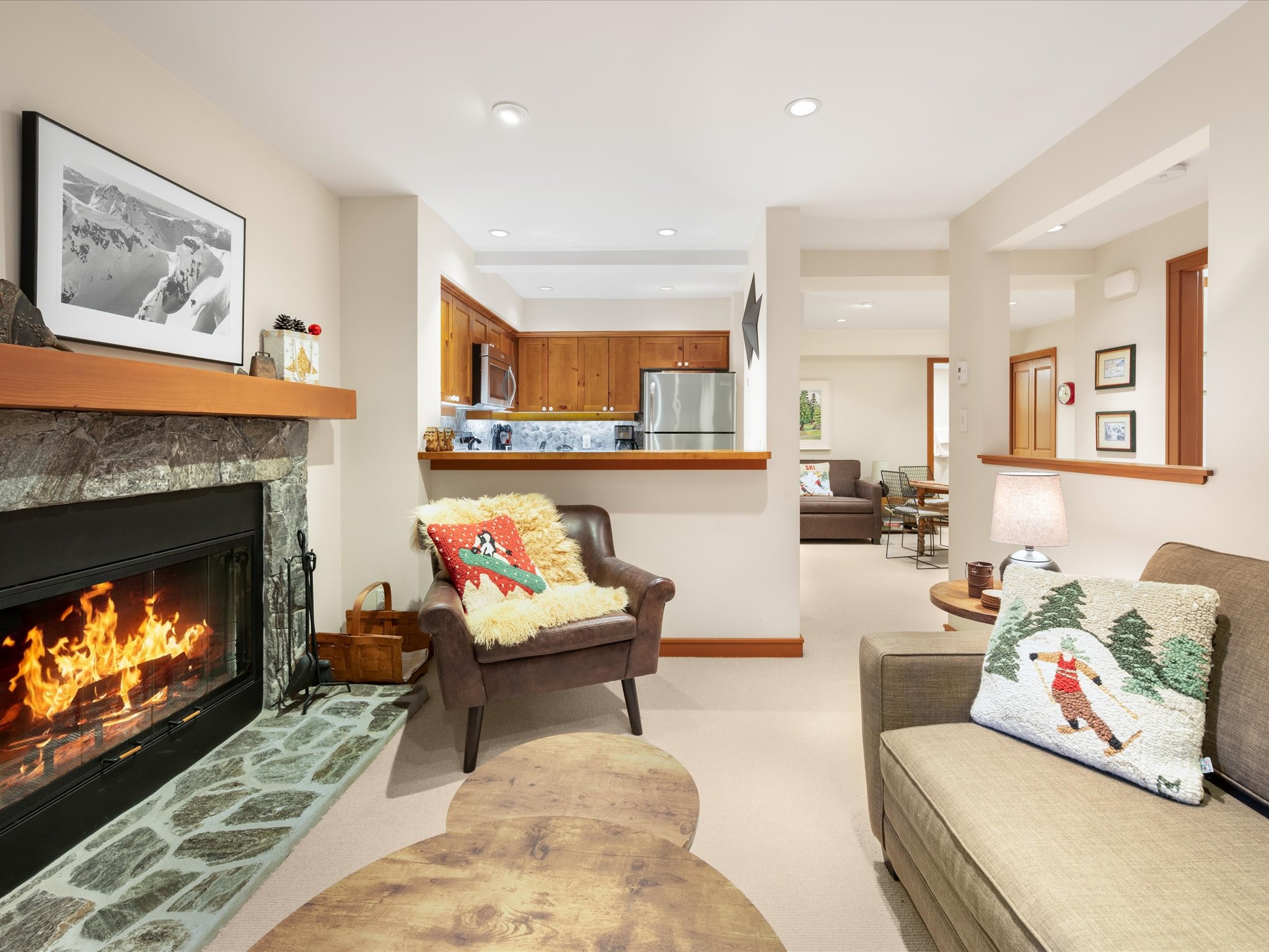 Beautifully updated and spacious 1-bedroom Treeline townhome, quietly situated on a private cul-de-sac in the Blackcomb Benchlands. Features heated slate floors, warm wood accents, wood-burning fireplace, and a large private patio with perfect for a BBQs overlooking a grassy yard. The kitchen includes solid pine cabinets, heated floors, and quality appliances. Treeline offers a ski-home trail, hot tub, secure underground parking with bike storage, and a private ski locker at the front door. Free public bus nearby. GST exempt.