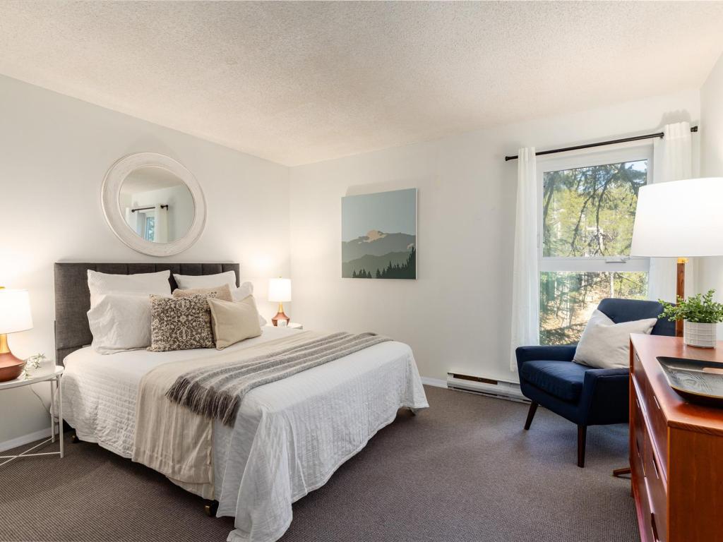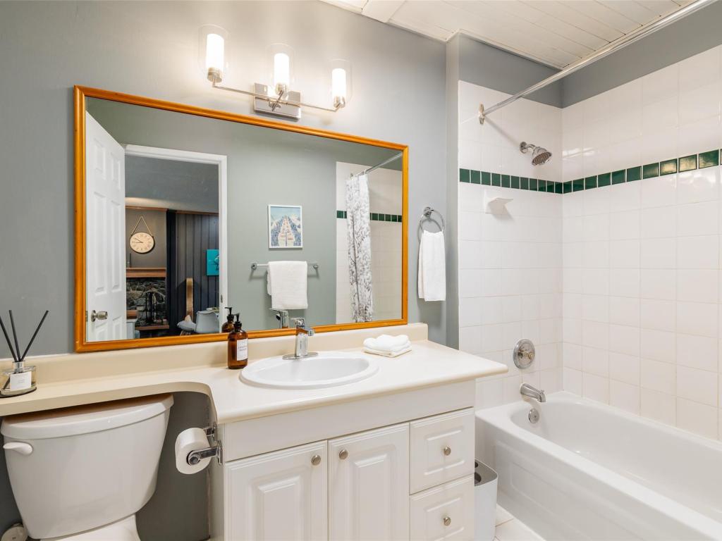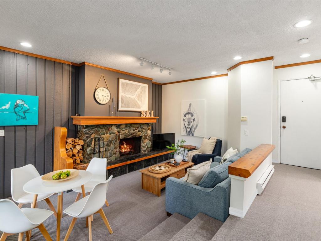 LAKESIDE 1-bed & 1-bath END-UNIT condo at Tamarisk on the shores of Alpha Lake! Recently painted, with new bathroom fixtures, lighting, and new wool carpets. Property features in-suite laundry and a private lakeside balcony on the quiet side of building A and parking for 4 cars! Large floorplan at 699 sq ft comfortably sleeps 4. Cozy wood fireplace is perfect after a day on the slopes! Located on the bus route and Valley Trail to Creekside and Function Junction. Tamarisk features a private dock, clubhouse, private storage unit, kayak storage, and 3 bike storage rooms. Zoned for full-time use and long-term rentals. No GST. Easy to show.